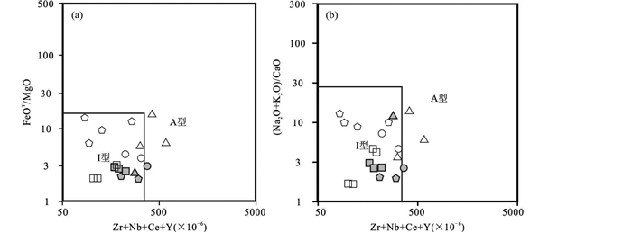 图 13 辽西兴城地区晚中生代花岗质岩石成因类型判别图解(底图据Whalen et al., 1987) Fig. 13 The discrimination diagrams of Late-Mesozoic granitoids in Xingcheng area, western Liaoning Province (base map after Whalen et al., 1987) |