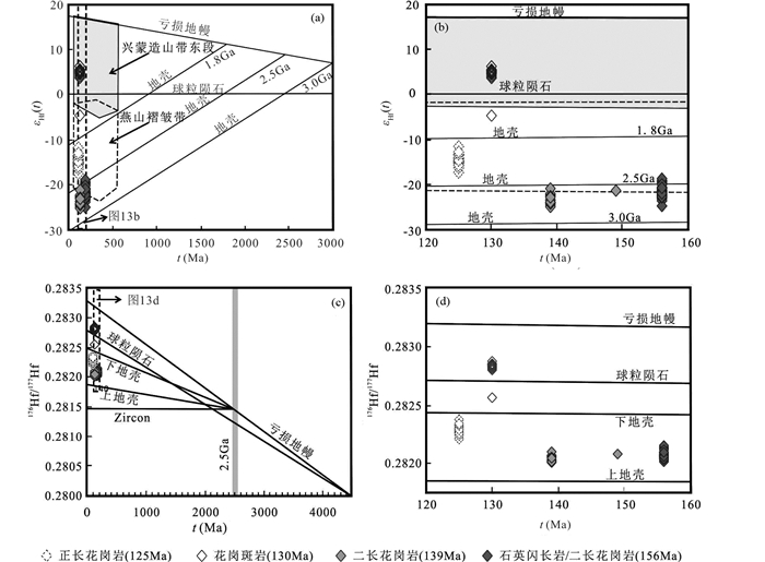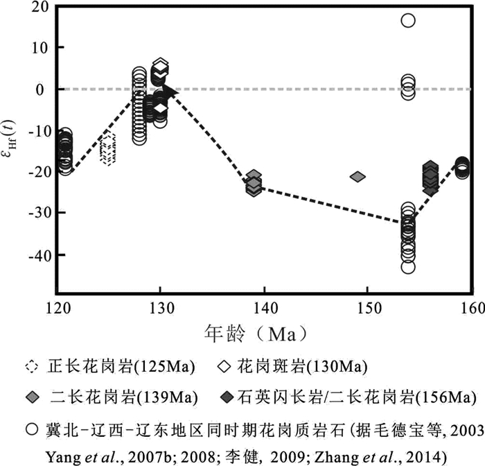 图 16 辽西兴城地区晚中生代花岗质岩石εHf(t)值与年龄协变图 Fig. 16 Diagram of variation trends between εHf(t) and ages of the Late-Mesozoic granitoids in Xingcheng area, western Liaoning Province |