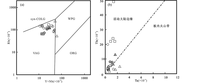 图 15 辽西兴城地区晚中生代花岗质岩石(Y+Nb)-Rb判别图解(a, 据Pearce et al., 1984)和Ta-Th判别图解(b, 据Schandl and Gorton, 2002) Fig. 15 The Y+Nb vs. Rb (a, after Pearce et al., 1984) and Ta vs. Th (b, after Schandl and Gorton, 2002) discrimination diagrams of Late-Mesozoic granitoids in Xingcheng area, western Liaoning Province |