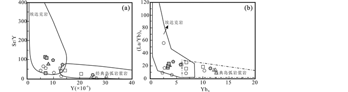 图 17 埃达克质岩石判别图解(底图据Martin, 1999) Fig. 17 The Sr/Y vs. Y (a) and (La/Yb)N vs. YbN (b) discrimination diagrams for adakitic rocks or classical island arc rocks (base map after Martin, 1999) |