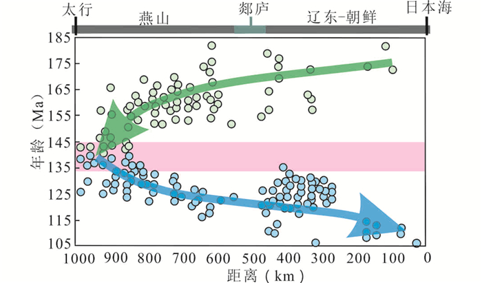 图 18 华北克拉通东部所在的东亚陆缘中生代岩浆作用时空迁移规律(据Niu, 2018; 郑建平和戴宏坤, 2018; 朱日祥和徐义刚, 2019) Fig. 18 Temporal and spatial migration trends of Mesozoic magmatism in East Asia continental margin, including eastern North China Craton (after Niu, 2018; Zheng and Dai, 2018; Zhu and Xu, 2019) |