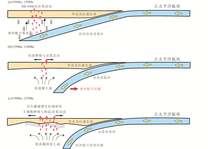 (4) 华北克拉通东部156~139Ma期间受到太平洋板块的持续俯冲作用,139~130Ma期间古太平洋俯冲板块发生回撤作用,并于130Ma后进入持续回撤作用造成的强烈区域伸展作用阶段。