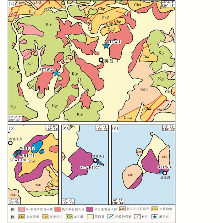 图 4 辽西兴城地区晚中生代花岗质岩体地质简图及采样位置 (a)英昌口岩体;(b)红崖子岩体;(c)笊篱头子岩体;(d)唐王洞岩体 Fig. 4 Simplified geological maps of Late-Mesozoic granitic plutons in Xingcheng area, western Liaoning Province and sampling locations (a) Yingchangkou pluton; (b) Hongyazi pluton; (c) Zhaolitouzi pluton; (d) Tangwangdong pluton |