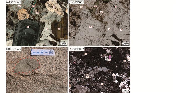 3 测试方法 3.1 LA-ICP-MS锆石U-Pb同位素测试分析本文样品粉碎、锆石挑选与制靶和阴极发光(CL)图像采集工作在河北省廊坊区域地质调查所实验室完成,在吉林大学地球科学学院深部探测野外试验与示范基地实验室采集锆石透反射光图像。STTW.1、STTW.2、STTW.16等3件样品在天津地质矿产所同位素实验室进行锆石U-Pb同位素测试分析,所用仪器为Neptune型质谱仪和UP193-FXArF准分子激光器,激光剥蚀束斑直径、剥蚀深度、频率分别为35μm、20~40μm和8~10Hz,U-Pb同位素分馏校正采用TEMORA和GJ-1外部年龄标准并以NISTSRM610玻璃标样做外标计算Pb、U、Th含量。普通铅校正采用208Pb(Andersen, 2002),数据处理和软件绘制程序为ICPMSDataCal和Isoplot(Ludwig, 2003);STWH1017和STWH1077等2件样品在吉林大学测试科学实验中心完成锆石U-Pb同位素测试分析,所用仪器为7500A型质谱仪和德国193-ArF准分子激光器,激光剥蚀束斑直径和频率分别为32μm、7Hz,U-Pb同位素分馏校正采用91500和GJ-1外部年龄标准并以NIST610玻璃标样做外标计算Pb、U、Th含量,同样采用208Pb进行普通铅校正,应用Glitter和Isoplot程序处理数据并绘制图件。