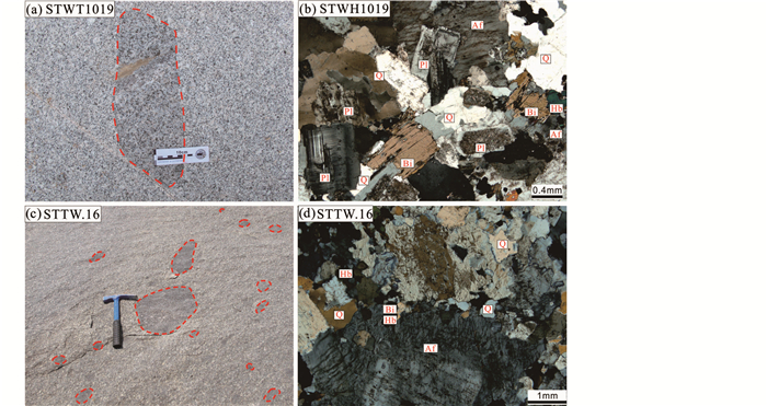 图 6 辽西兴城地区早白垩世花岗质岩石野外露头及显微照片 (a、b)红崖子二长花岗岩;(c、d)唐王洞石英正长岩.Bi-黑云母 Fig. 6 Field outcrops and photomicrographs of Late-Cretaceous granitoids in Xingcheng area, western Liaoning Province (a, b) monzogranite from Hongyazi pluton; (c, d) quartz syenite from Tangwangdong pluton. Bi-biotite |