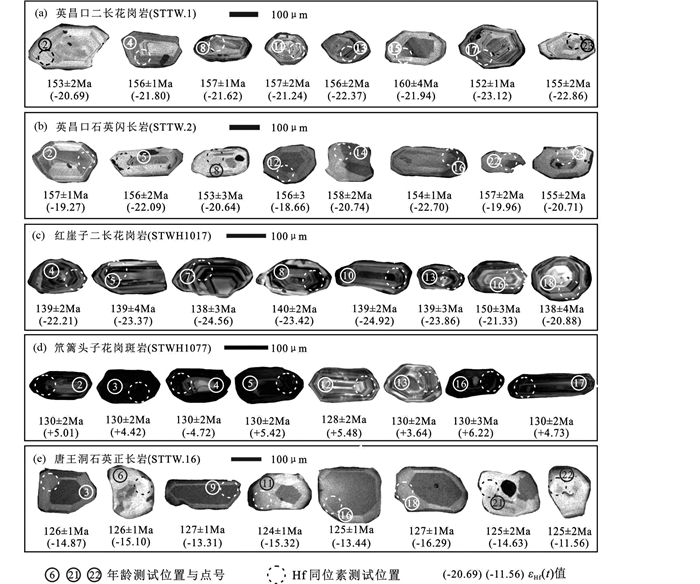 4 测试分析结果 4.1 同位素年代学本文对分别采自英昌口岩体(STTW.1、STTW.2)、红崖子岩体(STWH1017)、笊篱头子岩体(STWH1077)和唐王洞岩体(STTW.16)的5件花岗质岩石样品进行LA-ICP-MS锆石U-Pb同位素定年,测试分析结果详见表 2,部分锆石阴极发光(CL)图像见图 7。5件花岗质岩石样品中的锆石均呈自形-半自形,部分颗粒边部略有熔蚀,阴极发光(CL)图像显示内部结构清晰且岩浆振荡环带发育(图 7),并具有较高的Th/U比值(大多介于0.32~1.77,表 2),暗示均为岩浆成因锆石。