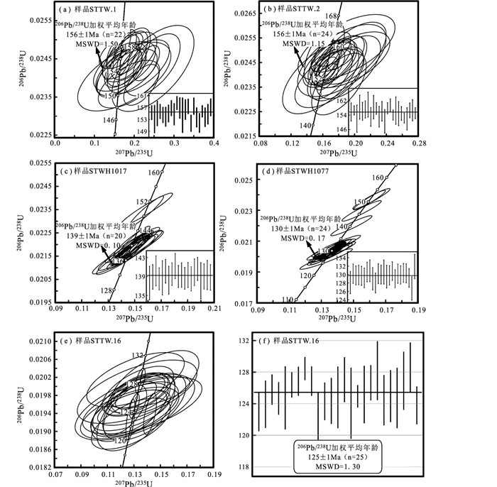 样品STTW.1(二长花岗岩)25个测试分析点的206Pb/238U表面年龄介于163~152Ma,在206Pb/238U-207Pb/235U谐和图中大多落于谐和线上或附近(图 8a),剔除3个偏离点之后的206Pb/238U加权平均年龄为156±1Ma(MSWD = 1.50,n = 22)。样品STTW.2(石英闪长岩)24个测试分析点的206Pb/238U表面年龄介于160~151Ma,在206Pb/238U-207Pb/235U谐和图中全部落于谐和线上或附近(图 8b),206Pb/238U加权平均年龄为156±1Ma(MSWD = 1.15,n = 24)。样品STWH1017(二长花岗岩)的测试分析点在206Pb/238U-207Pb/235U谐和图中落于谐和线上或附近(图 8c),2颗捕获锆石的206Pb/238U表面年龄分别为149Ma和150Ma,其余20个测试分析点的206Pb/238U表面年龄介于141~138Ma,其206Pb/238U加权平均年龄为139±1Ma(MSWD = 0.10,n = 20)。样品STWH1077(石英正长岩)的测试分析点在206Pb/238U-207Pb/235U谐和图中落于谐和线上或附近(图 8d),4颗早期捕获锆石的206Pb/238U年龄介于151~140Ma,其余24个测试分析点的206Pb/238U表面年龄介于132~127Ma,其206Pb/238U加权平均年龄为130±1Ma(MSWD = 0.17,n = 24)。样品STTW.16(石英正长岩)中25个测试分析点的206Pb/238U表面年龄介于129~122Ma,在206Pb/238U-207Pb/235U谐和图中均落于谐和线上或附近(图 8e),206Pb/238U加权平均年龄为125±1Ma(MSWD = 1.30,n = 25)(图 8f)。