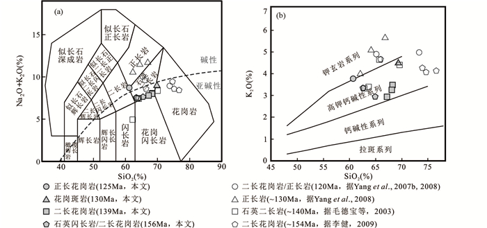 图 9 辽西兴城地区晚中生代花岗质岩石TAS图解(a, 据Irvine and Baragar, 1971)和SiO2-K2O图解(b, 据Peccerillo and Taylor, 1976) 图 13、图 15、图 17数据来源及图例同此图 Fig. 9 TAS (a, after Irvine and Baragar, 1971) and SiO2 vs. K2O (b, after Peccerillo and Taylor, 1976) diagrams of the Late-Mesozoic granitoids in Xingcheng area, western Liaoning Province Data sources and symbols in Fig. 13, Fig. 15 and Fig. 17 are same as in this figure |