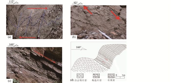 浪子山组位于辽河群最下部,与连山关花岗岩为韧性滑脱接触。在宏观尺度上,可见宽缓斜歪褶皱,轴向主要为NE或NEE向,形成于NW-SE向的区域性压扭性应力作用;在大北沟村(图 1b⑤处)发现浪子山组片岩发育典型的褶曲变形,小尺度的紧闭褶皱及与其相关的轴面片理,片理置换强烈(图 5a);局部还发育有小尺度的层间韧性剪切带(图 5b)。在三道岭处(图 1b①处)发现浪子山组中花岗质岩脉拉伸变形,具有典型右行剪切特征(图 5c)。
