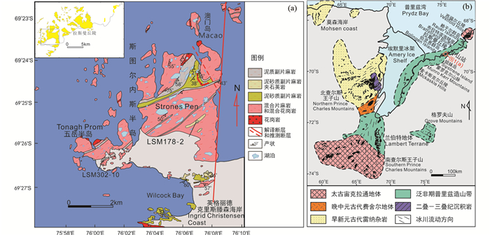 东南极普里兹构造带是东南极岩石出露最广泛的地区之一,包括埃默里冰架东缘、拉斯曼丘陵及西福尔丘陵等普里兹湾沿岸地区,西南可延至内陆格罗夫山(图 1b;Zhao et al., 1995; 刘小汉等, 2002; 俞良军等, 2002; Liu et al., 2009a, b; Tong et al., 2017)。已有研究表明该构造带遭受了新元古代格林威尔期(Grenvillian)和晚新元古代-早古生代泛非期(Pan-African)两期构造-变质事件(Zhao et al., 1991, 1992, 1995; Hensen and Zhou, 1995; Fitzsimons et al., 1997; Tong et al., 2017; 刘晓春, 2018)。不同区域内两期变质事件发育程度不同,不同程度的叠加作用使变质历史及分布特征复杂化。先前的研究已取得了重要进展,但由于不同程度叠加变质作用的存在,对不同地区两期变质事件性质的认识尚存分歧。一种观点认为新元古代格林威尔期变质作用反映了罗迪尼亚超大陆相关的碰撞造山过程,泛非期的变质作用代表了陆内改造(Wilson et al., 2007; Tong et al., 2002, 2014);另一种观点认为早期的格林威尔期变质作用是局部的,泛非期的变质作用占主导地位,反映了早古生代冈瓦纳大陆汇聚相关的碰撞造山过程(Zhao et al., 1991, 1992, 1995; Hensen and Zhou, 1995; Carson et al., 1997; Liu et al., 2009b)。这些分歧产生的原因包括:缺少对该地区不同地质单元变质历史的全面了解,缺乏变质作用期次与时代之间的对应关系等。因此,对该区出露岩石进行深入研究有助于加强对该地区变质历史的了解,也有助于进一步理清普里兹构造带的多期变质热事件的属性以及各自对应的大地构造背景。