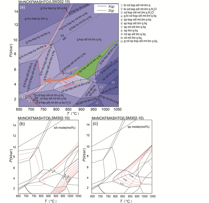 图 6 样品LSM302-10在MnNCKFMASHTO体系下视剖面图及成分等值线 全岩成分SiO2:80.516;Al2O3:5.919;CaO:0.068;MgO:1.085;FeO:7.750;K2O:1.191;Na2O:0.194;TiO2:0.682;MnO:0.045;O:1.550;H2O:1.000 (mol%).等值线包括夕线石含量、尖晶石含量等值线以及石榴石X(Fe)、Z(Ca)成分等值线等 Fig. 6 The P-T pseudosection and compositional isopleth in the MnNCKFMASHTO system for Sample LSM302-10 Bulk composition: SiO2: 80.516; Al2O3: 5.919; CaO: 0.068; MgO: 1.085; FeO: 7.750; K2O: 1.191; Na2O: 0.194; TiO2: 0.682; MnO: 0.045; O: 1.550; H2O: 1.000 (mol%). The contoured isopleths include sillimanite and spinel modes and X(Fe), Z(Ca) of garnet |