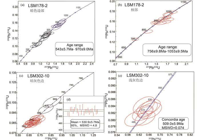 表 3 锆石U-Pb定年结果 Table 3 Zircon U-Pb data for gneisses (LSM178-2, LSM302-10) |