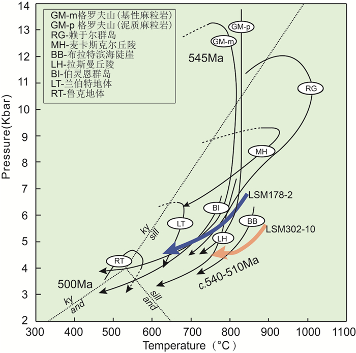 6.2 变质时代研究显示东南极普里兹构造带受到新元古代格林威尔期构造热事件和晚新元古代-早古生代泛非期构造热事件的影响(Zhao et al., 1995; 仝来喜等, 1998, 2012; Tong et al., 2002; Wang et al., 2008; Grew et al., 2012)。但不同地区对两期变质事件的记录差异极大。格林威尔期高级变质事件的主要证据包括:来自于拉斯曼丘陵之西的姐妹岛(Søstrene Island)的石榴二辉麻粒岩,石榴石-全岩Sm-Nd等时线定年揭示该麻粒岩的主期矿物组合形成于~990Ma(Hensen and Zhou, 1995);埃默里冰架东缘在赖因博尔特丘陵(Reinbolt Hills)长英质正片麻岩中锆石记录了925±24Ma的变质事件,蒙罗克尔山(Munro Kerr Mountains)等地的长英质正片麻岩中发育900~930Ma的变质锆石(Liu et al., 2009a);拉斯曼丘陵之东的西福尔丘陵(Vestfold Hills)中元古代基性岩墙在938±9Ma至957±7Ma之间发生中压麻粒岩相变质作用(Liu et al., 2014);Wang et al. (2008)在拉斯曼丘陵南部斯图尔内斯半岛获得长英质正片麻岩,在格林威尔期的变质年龄为~997±13Ma和~981±13Ma。这一时期还发育花岗质或紫苏花岗质岩体(Wang et al., 2008; Liu et al., 2009a; Grew et al., 2012)。尽管这些年龄存在很大差异,所代表地质事件的具体性质也不甚清晰,但的确表明格林威尔期变质事件在普里兹造山带的基底中广泛存在。拉斯曼丘陵地区副片麻岩中该期事件的确切记录相对较少。Kelsey et al. (2007)在拉斯曼丘陵以东的赖于尔(茹尔)群岛和以西的伯灵恩群岛的部分副片麻岩石榴石中识别出780~1030Ma的独居石包裹体。副片麻岩中的锆石暗色边部常常给出很宽的年龄范围(ca. 500~1100Ma),局部集中的一些较老的年龄被解释成格林威尔期变质事件的影响(Wang et al., 2008)。样品LSM178-2锆石暗色边年龄具有类似的分散分布特征(543±5.7Ma~970±9.0Ma),较老的970Ma左右的年龄可能反映了格林威尔期变质事件的影响。然而,由于有些锆石变质边可能代表了不彻底的重结晶或遭受一定程度的Pb丢失(Halpin et al., 2012, 2020),相应的年龄不一定代表具体的地质事件,该地区格林威尔期变质事件的确切时间和影响范围还需进一步厘清。锆石变质边获取的最低年龄543±5.7Ma应反映了泛非期构造热事件的影响。样品LSM302-10中锆石变质边主要记录泛非期变质年龄,但其暗色边和浅色边具有不同年龄(531±5.7Ma和509±5.9Ma)。这些泛非期变质年龄可能反映了持续较长时间的构造事件(ca. 540~510Ma)。样品中的矿物组合反映了连续的演化过程,年龄结果支持这些矿物组合主要在泛非期发育,对应的P-T轨迹反映了泛非期的演化过程。