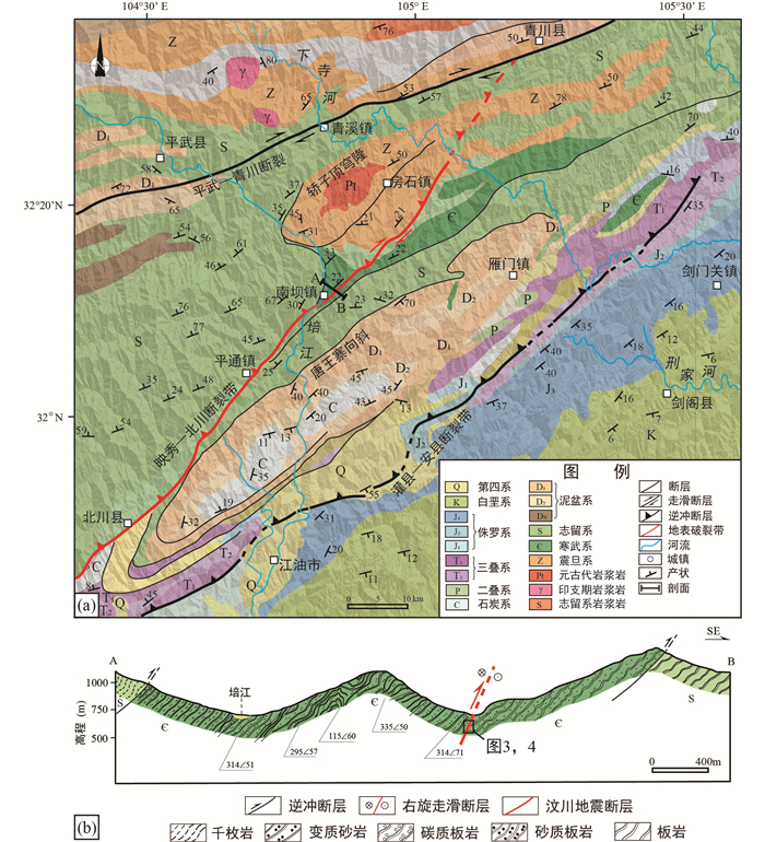 图 2 映秀-北川断裂带北东段构造地质图(a,据中国地质调查局发展研究中心,中国地质科学院,2008①;四川省地质调查院,2012②修改)及地质剖面(b) Fig. 2 Tectonic and geological map (a) and cross section (b) of the NE segment of the Yingxiu-Beichuan fault belt |