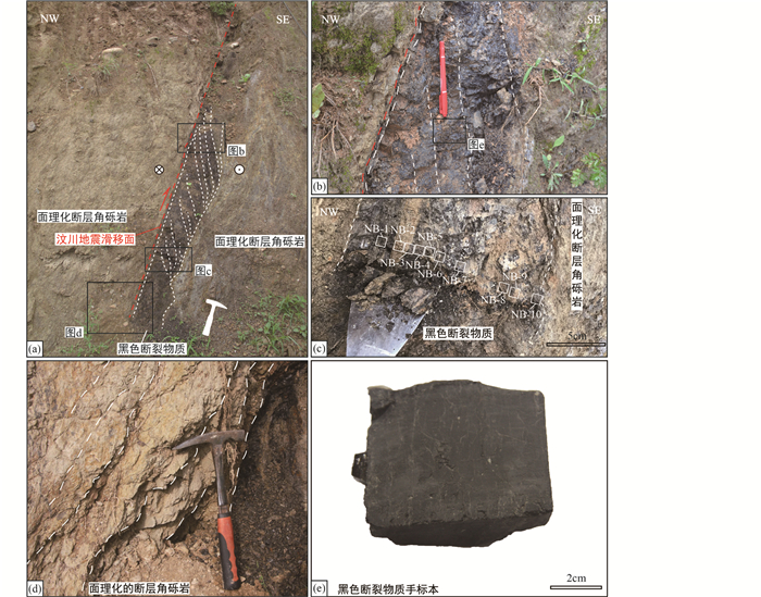 图 5 南坝地区北川断裂带断裂岩特征 (a)断裂带核部黑色物质层中可见面理(白色虚线);(b)断裂带核部露头,顶部(黑色物质层NW侧边界)为汶川地震滑动带(红色虚线);(c)中心黑色物质层的露头,标记有连续采样点(NB-1~10);(d)面理化的断层角砾岩;(e)黑色断裂物质手标本 Fig. 5 Fault rocks of the Beichuan fault zone in Nanba area (a) foliations occurred within the black material layers in the core of the fault zone (white dashed line); (b) outcrop of the core of the fault zone, the top (NW boundary of the black material layer) is the co-seismic slipping zone of the Wenchuan earthquake (red dashed line); (c) outcrop of the black material layer, showing continuous sampling locations (NB-1 to 10); (d) fault breccia are characterized by well-developed foliations; (e) specimen of the black material |