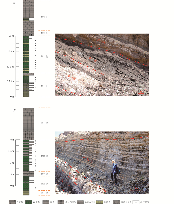 按典型的野外露头剖面岩性变化和组合特征,阿克苏地区下寒武统玉尔吐斯组自下而上可进一步划分为五段(图 1b):灰黑色、褐红色薄层状含磷质结核硅质岩(第一段),薄层灰黑色泥页岩夹硅质岩(第二段),灰色中厚层砂屑白云岩(第三段),灰黑色泥页岩夹灰色、灰白色白云岩或灰岩(第四段),灰白色瘤状及薄层白云岩(第五段)。其中,黑色岩系段主要分布在第一至第二段(第一套黑色岩系)和第四段(第二套黑色岩系)。