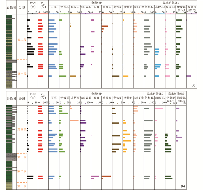 图 3 玉尔吐斯组黑色岩系典型剖面岩性、矿物组成和有机质特征综合柱状图 (a)什艾日克剖面; (b)昆盖阔坦剖面 Fig. 3 Charts showing lithology, mineralogy and organic matter characteristics of the Yurtus black rock series |