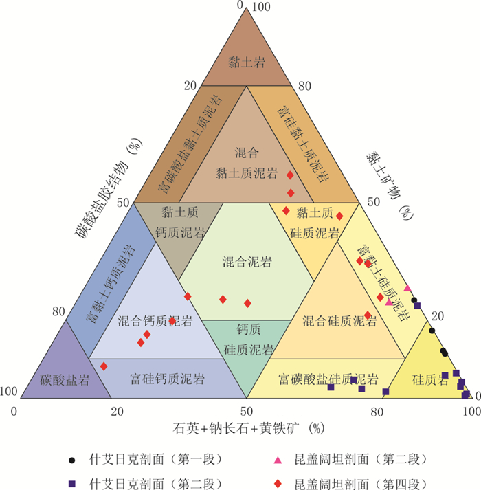总体而言,矿物组分的差异导致这两个剖面黑色岩系段纵向上的岩石类型分异明显,第一套黑色岩系——第一段(什艾日克剖面)和第二段(什艾日克剖面和昆盖阔坦剖面)以硅质泥页岩和硅质岩为主,硅质含量高;而第二套黑色岩系——第四段(昆盖阔坦剖面)则含有较多的黏土矿物和碳酸盐胶结物(图 4)。