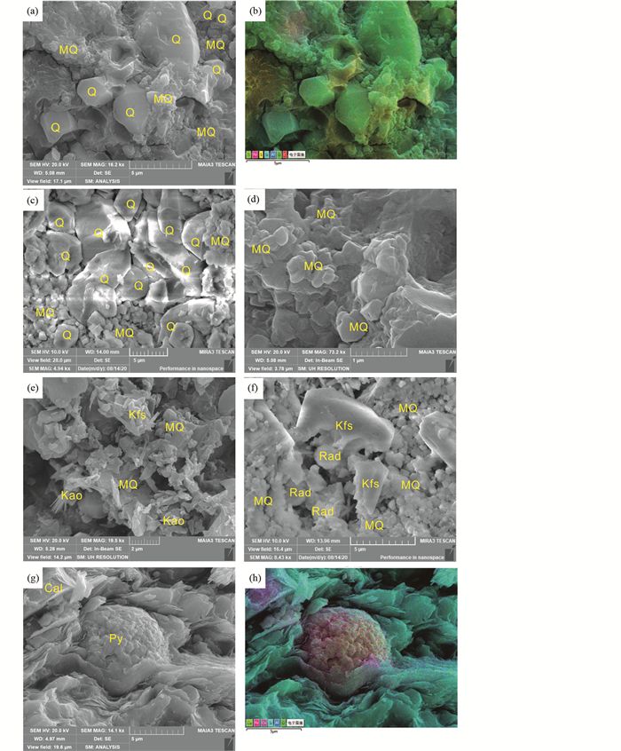 场发射扫描电镜观察及能谱分析显示,微晶石英是研究区主要的硅质胶结类型,由短棱柱状微晶石英晶体构成,多呈连续的巢状集合体广泛分布,单个晶体多为亚微米级,常在碎屑石英颗粒表面或附近成核(图 5a-d),也见于(钾)长石溶蚀处附近(图 5e),局部可见与放射虫和硅质海绵骨针等生物碎屑相共生(图 5f),以在第一套黑色岩系中发育最为显著。