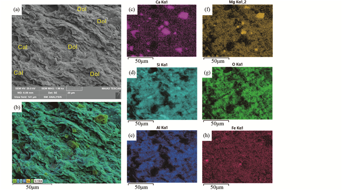 图 6 玉尔吐斯组黑色岩系碳酸盐胶结物特征与能谱面扫描结果 (a)昆盖阔坦剖面第四段(样品号ASK-21),白云石和方解石胶结物较为发育; (b)对应图(a)的能谱面扫描结果; (c)至(h)分别为钙、硅、铝、镁、氧、铁元素的面分布图. Dol-白云石 Fig. 6 Characteristics of carbonate cements and related EDS images of the black rock series of the Lower Yurtus Formation from outcrops |