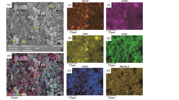 图 7 玉尔吐斯组黑色岩系硫酸盐胶结物特征与能谱面扫描结果 (a)昆盖阔坦剖面第二段(样品号ASK-48),石膏和重晶石较为发育; (b)对应图(a)的能谱面扫描结果; (c)至(h)分别为钡、硫、硅、钙、氧、镁元素的面分布图. Gp-石膏; Brt-重晶石 Fig. 7 Characteristics of sulfate cements and related EDS images of the black rock series of the Lower Yurtus Formation from outcrops |