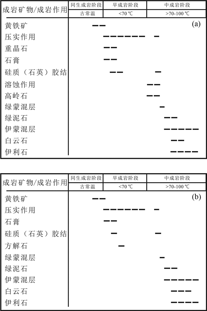 图 8 玉尔吐斯组黑色岩系成岩序列 (a)第一套黑色岩系成岩演化特征;(b)第二套黑色岩系成岩演化特征 Fig. 8 Interpreted paragenetic sequence for the black rock series of the Yurtus Formation |