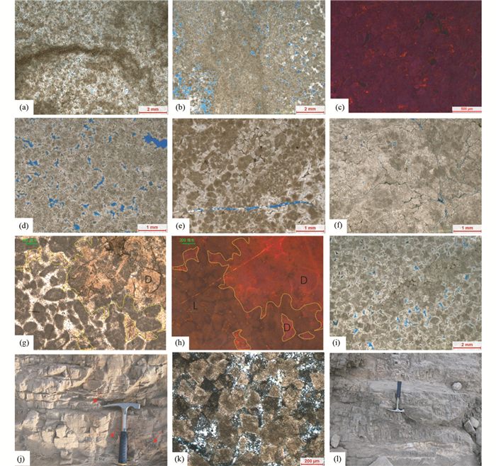 该类岩石露头上表现为灰色-深灰色中层状,可见交错层理发育。显微镜下,残余颗粒结构可识别(图 4b),主要由细-中晶自形-半自形白云石构成,阴极发光下为褐色-暗紫红色,见环带状特征(图 4c),白云石排列表现出受原岩结构的明显控制(图 4b, d),原颗粒部位白云石紧密接触,颗粒间亮色加大环边增多,孔隙多继承自原粒间孔隙。