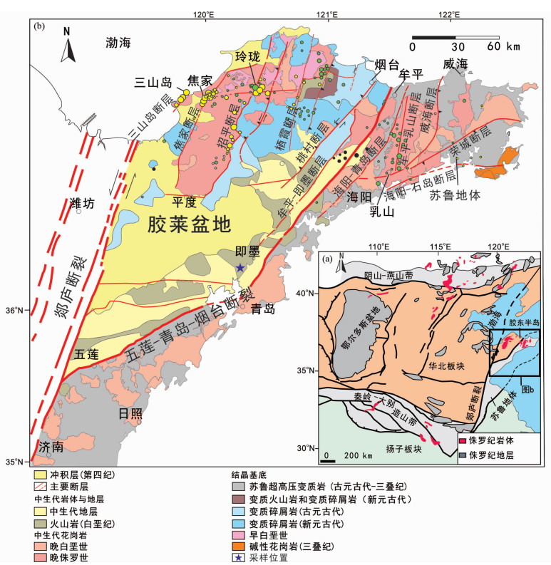 胶莱盆地是一个白垩纪断陷拉分盆地,呈北东东向不规则展布,西部较宽东部较窄,南部呈弧形向北凸起(Xie et al., 2012; 付文钊等, 2014)。该盆地经历了多阶段构造演化历史,可分为早白垩世莱阳期、青山期和晚白垩世王世期三个盆地构造伸展阶段(匡永生等, 2012),其形成受控于郯庐断裂和牟平-即墨断裂,两条断裂因右行拉分影响胶莱盆地的形成与发展(Zhu et al., 2012)。