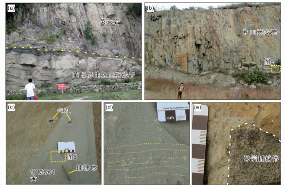 图 2 马山粗面英安岩野外岩相特征 (a)粗面英安岩与莱阳群曲格庄组砂岩不整合接触;(b)柱状节理;(c)气孔及晶洞构造;(d)流纹构造;(e)砂岩捕虏体 Fig. 2 Photographs showing characteristics of texture and lithology of the trachy-dacite in Mashan (a) unconformities relationship between trachy-dacite and sandstone of the Qugezhuang Formation of Laiyang Group; (b) columnar joints; (c) vesicular structure and geode structure; (d) rhyolitic structure; (e) sandstone xenoliths |