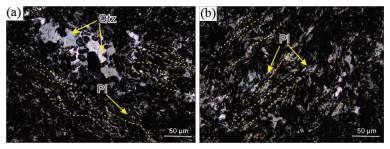 图 3 马山粗面英安岩正交偏光下显微岩相学特征 黄色虚线代表流纹构造. Qtz-石英; Pl-斜长石 Fig. 3 Photomicrographs under cross-polarized light of the trachy-dacite in Mashan Yellow dash lines represent rhyolitic structure. Qtz-quartz; Pl-plagioclase |