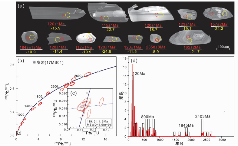 3 测试结果 3.1 锆石U-Pb同位素年代学粗面英安岩样品(17MS01)锆石U-Pb年代学测试结果如下表 1所示。锆石晶体呈长柱状或短柱状、自形-半自形晶体、少数锆石为他形粒状晶体,大小为10~50μm×100~150μm,锆石内部没有裂痕且结构清晰,透明度高(图 4a)。年龄值为120Ma左右的锆石晶形完好呈柱状多为自形晶,磨圆差呈棱角状,锆石内部明显可见岩浆成因的震荡环带结构(图 4a)。年龄值为1800Ma和2400Ma的锆石晶体呈长柱状和短柱状,磨圆为次圆状(图 4a)。