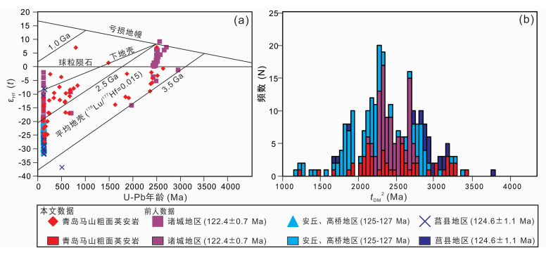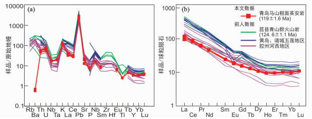 前人对于胶莱盆地青山群火山岩的成因认识存在分歧。有学者认为是华北克拉通下地壳部分熔融所形成(付文钊等, 2014; Ma et al., 2014),也有学者认为是由包含有扬子古地壳成分的富集岩石圈地幔和下地壳部分熔融并相互混染形成(郑永飞等, 2018),Ling et al. (2009)开展岩石学、年代学、主微量地球化学和Sr-Nd同位素研究认为胶莱盆地青山群火山岩为典型的板内拉张裂谷形成的双峰式火山岩。显然,胶莱盆地内火山岩成因的争议制约了对盆地演化以及华北克拉通岩石圈减薄的认识。