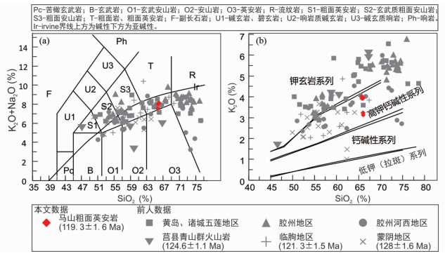 对于胶东青山群火山岩广泛的活动时限,部分学者认为这是由于青山群火山岩形成年龄由西向东逐渐变年轻(邱检生等, 2001; 凌文黎等, 2006)。匡永生等(2012)则认为胶东青山群火山岩是双峰式岩浆作用的产物,且基性岩浆活动时限(122~113Ma)早于酸性岩浆活动时限(110~98Ma)。综合上述年代学资料本文认为山东青山群火山岩活动年龄上限在130Ma左右,活动年龄下限为98Ma左右,岩浆活动的高峰期在120Ma左右。上述年代学资料也表明,胶东青山群火山岩年龄并未明显表现出由西向东逐渐变小的趋势。此外胶莱盆地青山群火山岩TAS图解显示胶莱盆地基性-中性-酸性火山岩是连续分布的,并非只存在基性火山岩和酸性火山岩两个端元(图 6a)。本文报道的马山粗面英安岩、临朐粗面岩以及即墨驯虎山流纹岩等中酸性岩石的成岩年龄与前人报道的基性岩浆年龄(Ar-Ar,122~113Ma;匡永生等, 2012)相一致。因此,本文认为山东青山群火山岩广泛的成岩年龄并非是双峰式岩浆作用的结果,而更有可能是与区域内构造活动有关。此外,马山粗面英安岩还存在800Ma、1800Ma和2400Ma左右的年龄峰值,这类锆石显示出无震荡环带的四面体晶体结构(图 4a),表明它们是可能继承锆石而并非岩浆锆石(Liang et al., 2020)。