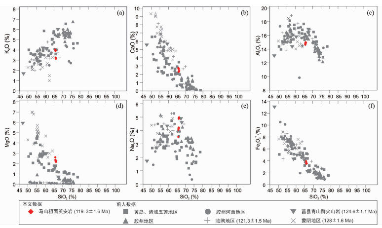 图 8 胶莱盆地中生代青山群火山岩哈克图解 Fig. 8 Plots of SiO2 against selected major element contents for Mesozoic volcanic rocks of the Qingshan Group from Jiaolai Basin |