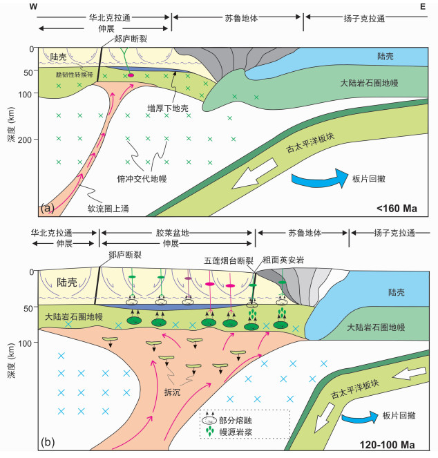 综上所述,本文认为三叠纪时期(240~200Ma)扬子板块与华北板块发生碰撞,扬子板块东段首先与华北板块相接触,郯庐断裂带也随之形成。约160Ma以来俯冲的古太平洋板块开始回撤,并在软流圈热侵蚀作用下华北克拉通深部岩石圈开始减薄(图 9a)。在早白垩世晚期(120~100Ma),由于高角度俯冲的古太平洋板块俯冲方向改变为北偏西方向,同时开始大规模回撤,从而诱发华北板块陆内扩张,导致上覆岩石圈大规模减薄。同时郯庐断裂受到的挤压应力减小,在上地壳发育为一系列的拉张正断层和张性盆地,从而造成郯庐断裂带快速沉降并且伴随着强烈的火山作用(图 9b)。胶莱盆地也在这一时期开始快速断陷、拉分,并伴随大面积青山群火山岩喷发,从而演化形成火山盆地。