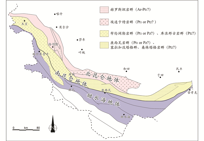 1 区域地质背景西昆仑造山带在区域构造分区上自北向南大致可分为北昆仑地体、南昆仑地体和甜水海地体三部分(图 2)。位于最北侧的北昆仑地体一般认为是塔里木克拉通的南缘,其组成以赫罗斯坦岩群和埃连卡特岩群为代表(图 2)。其中赫罗斯坦群是已知的在西昆仑地区出露的最古老的变质杂岩,主要分布在阿卡孜一带,为一套条带状、强混合岩化的片麻岩类,可能是一套TTG岩石组合(张传林等, 2003a),侵入其中的阿卡孜岩体的年龄为2.4Ga(张传林等, 2003a);埃连卡特群为分布于铁克里克一带的变质沉积岩,碎屑岩研究显示其沉积时代不会晚于1.0Ga,并经历了约0.9Ga变质改造(张传林等, 2003b, 2007; 王超等, 2009; 康磊等, 2014; Ye et al., 2016)。北昆仑地体主要记录了塔里木南缘的历史,与塔里木克拉通早期的演化有关。