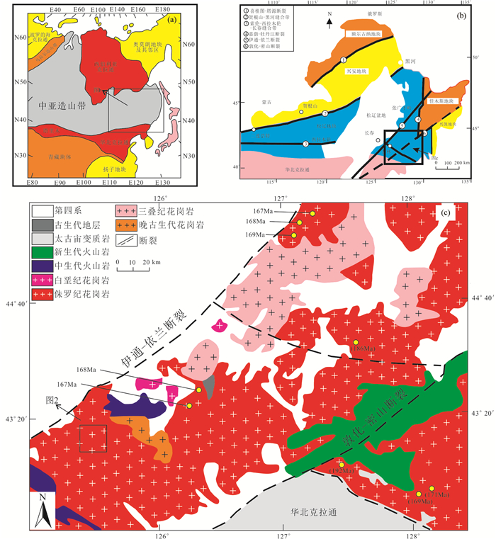 本文研究区区域构造位置属于华北克拉通北部、中亚造山带东段以及西环太平洋外带结合部位(李锦轶, 1998; 葛文春等, 2007; Wu et al., 2011; 王志伟, 2017; 王琳琳, 2018),区域上处于伊通-依兰断裂、敦化-密山断裂、西拉木伦-长春-延吉缝合带所挟持的区域内(图 1c)。区域上各时代地层都有出露(吴福元和曹林, 1999)。区域火成岩比较发育,主要出露的火成岩有华力西期花岗闪长岩、斜长花岗岩、二长岩,三叠纪花岗斑岩、花岗闪长岩,燕山期花岗闪长岩、二长花岗岩、正长花岗岩、花岗斑岩、细粒花岗岩等。