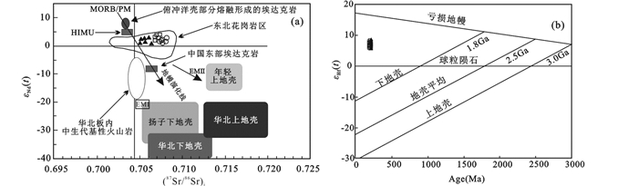 后倒木三种花岗质岩石具有相似的同位素组成,显示了同源岩浆的特征,即初始锶(相对较低0.706319~0.707782)、εNd值(为正+2.38~+3.95),而且具有年轻的Nd同位素二阶段模式年龄(tDM2=639~768Ma)。在(87Sr/86Sr)i-εNd(t)岩石成因模拟图解中,后倒木花岗质岩石的样品点基本落在东北地区花岗岩区域中(图 10a);其εNd(t)值(+2.38~+3.95)与兴蒙造山带显生宙时期花岗岩的εNd(t)值(-2.2~+7.1, 平均值为+2.0)一致(吴福元等, 1999; 吴福元和孙德有, 1999; Wu et al., 2000; Yang et al., 2017),显示其可能来自新生地壳或亏损地幔。实验岩石学已经证明,岩石圈地幔部分熔融只会生成玄武质熔体,无法直接形成花岗质熔体,而花岗质岩浆只有通过大量的玄武质岩浆才能产生(Wyllie, 1984)。其源区应该是新生地壳。上述研究表明后倒木花岗质岩石是由亏损地幔经过部分熔融形成新生下地壳后,再次熔融形成的。该结论与前人通过研究从而获得的锶钕同位素结果相一致,即东北地区的绝大部分花岗岩都显著具有低的初始锶和高的初始钕还有年轻的钕二阶段模式年龄(邵济安等, 2002)。