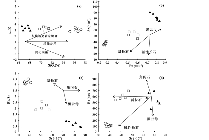 图 11 后倒木花岗质岩石SiO2-εNd(t)、Eu-Sr、Sr-Rb/Sr和Sr-Ba判别图解 Fig. 11 Diagrams of SiO2 vs. εNd(t), Eu vs. Sr, Sr vs. Rb/Sr and Sr vs. Ba of granitoids in the Houdaomu |