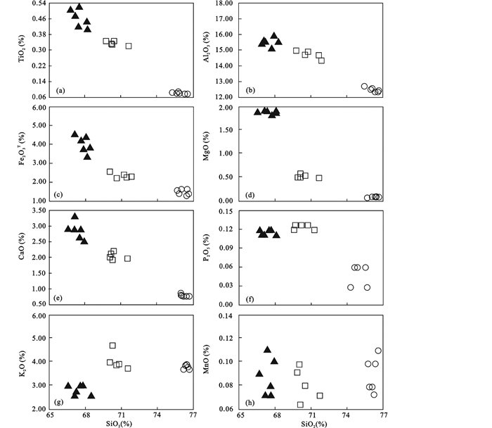 图 12 后倒木花岗质岩石Harker图解 Fig. 12 Diagrams of SiO2 against predominant oxides of granitoids in the Houdaomu |