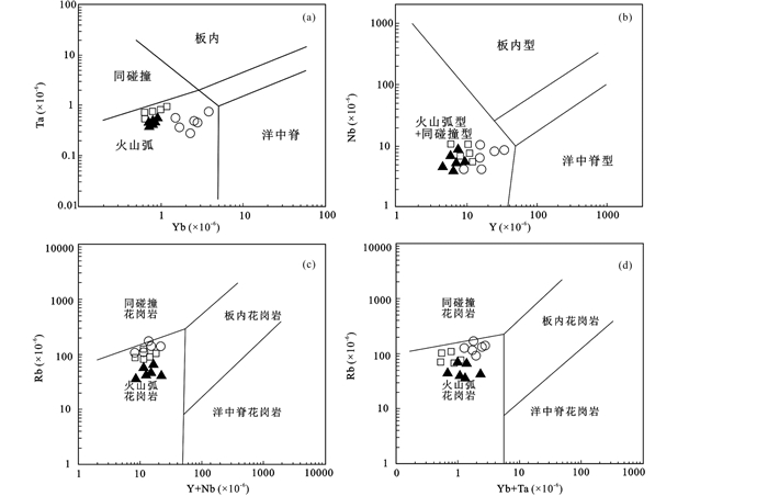 图 13 后倒木花岗质岩石的Yb-Ta (a)、Y-Nb (b)、(Y+Nb)-Rb (c)、(Yb+Ta)-Rb (d)构造环境判别图解(据Pearce et al., 1984) Fig. 13 Tectonic setting discrimination diagrams of Yb vs. Ta (a), Y vs. Nb (b), Y+Nb vs. Rb (c) and Yb+Ta vs. Rb (d) for granitoids in Houdaomu (base map after Pearce et al., 1984) |