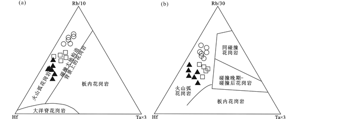 图 14 后倒木花岗质岩石的Rb/10-Hf-Ta×3 (a)和Rb/30-Hf-Ta×3 (b)构造环境判别图解(据Pearce et al., 1984) Fig. 14 Tectonic setting discrimination diagrams of Rb/10-Hf-Ta×3 (a) and Rb/30-Hf-Ta×3 (b) for granitoids in the Houdaomu (base map after Pearce et al., 1984) |