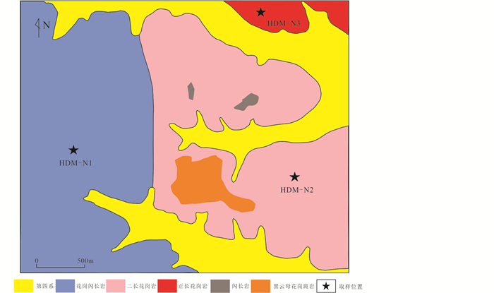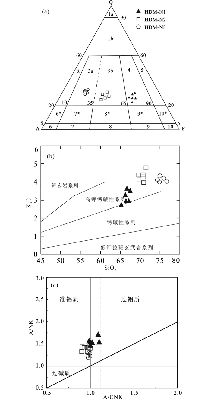 本文在详细观察识别各种岩性侵入体的基础上,于后倒木地区采集了新鲜的花岗闪长岩(HDM-N1)、二长花岗岩(HDM-N2)和正长花岗岩(HDM-N3)样品(图 2、图 3)。花岗闪长岩颜色主要为灰色,中-粗粒花岗结构,块状构造(图 3c)。主要矿物有角闪石、斜长石、石英、黑云母等。在偏光显微镜下可见:角闪石呈针状和柱状,半自形,含量20%~30%;而半自形板状的斜长石,其粒径为1.0~3.0mm,含量约为60%,发育聚片双晶;石英呈他形粒状,粒径1.0~3.0mm,含量5%,晶面较干净;黑云母的含量约为3%~5%。二长花岗岩,不等粒结构,块状构造。主要矿物有碱性长石、斜长石、石英、黑云母等。斜长石呈半自形板状,含量大约为35%左右,粒度介于1.5~3.0mm之间;碱性长石为半自形柱状或短柱状,含量40%,粒度0.5~3.0mm;石英呈他形粒状,含量约为20%,粒度介于0.5~2.5mm之间;镜下呈片状的黑云母,其粒度基本介于0.5~1.5mm之间,含量一般为3%~5% (图 3d, f)。正长花岗岩,具花岗结构,块状构造;主要由长石、石英、黑云母等矿物组成。石英以显晶粒状产出,颗粒大小约为0.1~1.2mm,主要集中在0.3~0.6mm,含量约占50%。长石主要有微斜长石、斜长石,微斜长石粒度大小约为0.2~1mm,主要集中在0.3~0.6mm,含量约占30%;斜长石粒径与微斜长石相当,含量约占15%;黑云母粒度较小,长短轴比一般为2∶1,长轴多为0.2mm,含量约占5%(图 3e)。