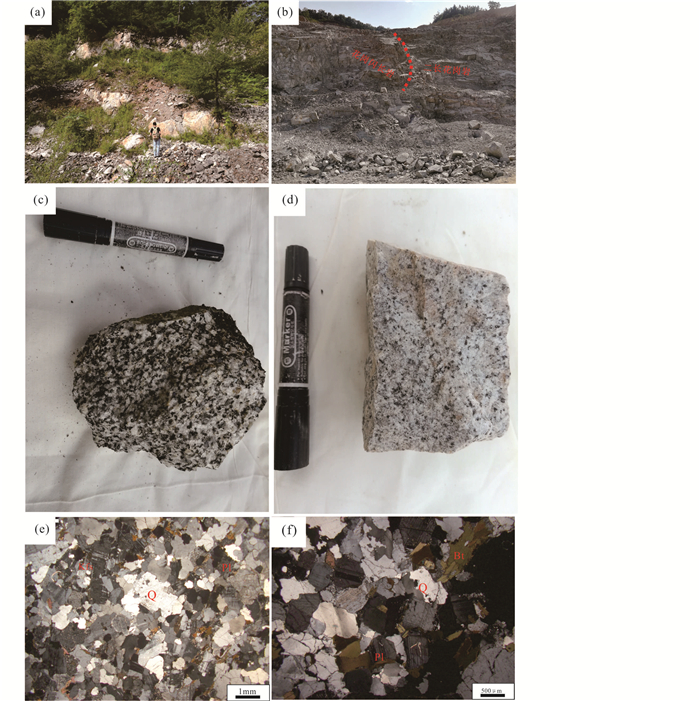 图 3 后倒木花岗岩类岩石野外及镜下照片 (a、b)花岗闪长岩、正长花岗岩与二长花岗岩的野外露头;花岗闪长岩(c)和二长花岗岩(d)手标本照片;正长花岗岩(e)和二长花岗岩(f)显微照片(+). Q-石英;Pl-斜长石;Kfs-钾长石;Bt-黑云母 Fig. 3 Field and petrographic photos of granitoids in the Houdaomu (a, b) field photos of the granitoids; hand specimens of granodiorite (c) and monzogranite (d); micrographs of syenogranite (e) and monzogranite (f) under CPL. Q-quartz; Pl-plagioclase; Kfs-K-feldspar; Bt-biotite |