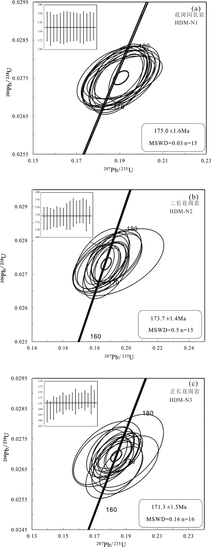 花岗闪长岩样品HDM-N1中的锆石晶体长度较短,从70μm到150μm不等。我们选择其中15颗锆石颗粒进行同位素年龄测定,所有点的测试结果均落在谐和线上或附近,获得其U-Pb一致年龄为174.8±0.8Ma,与加权平均值175.0±1.6Ma非常一致(图 5a),代表花岗闪长岩的形成时代。
