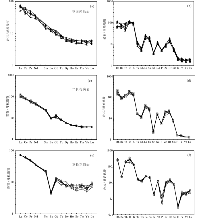 图 7 后倒木花岗质岩石球粒陨石标准化稀土元素配分图(a、c、e)和原始地幔标准化微量元素蛛网图(b、d、f)(标准化值据Sun and McDonough, 1989) Fig. 7 REE chondrite-normalized patterns (a, c, e) and primitive mantle-normalized spider diagrams (b, d, f) of granitoids in the Houdaomu (normalization values after Sun and McDonough, 1989) |