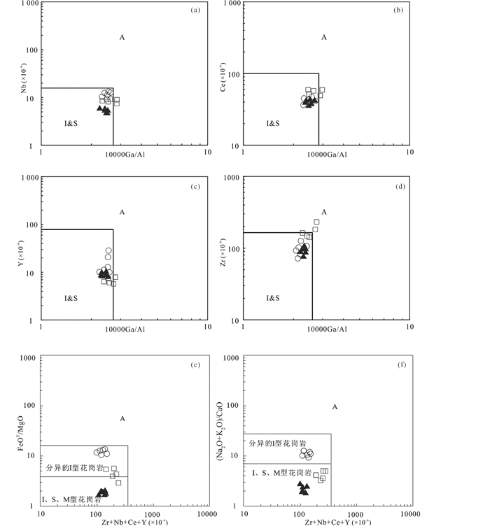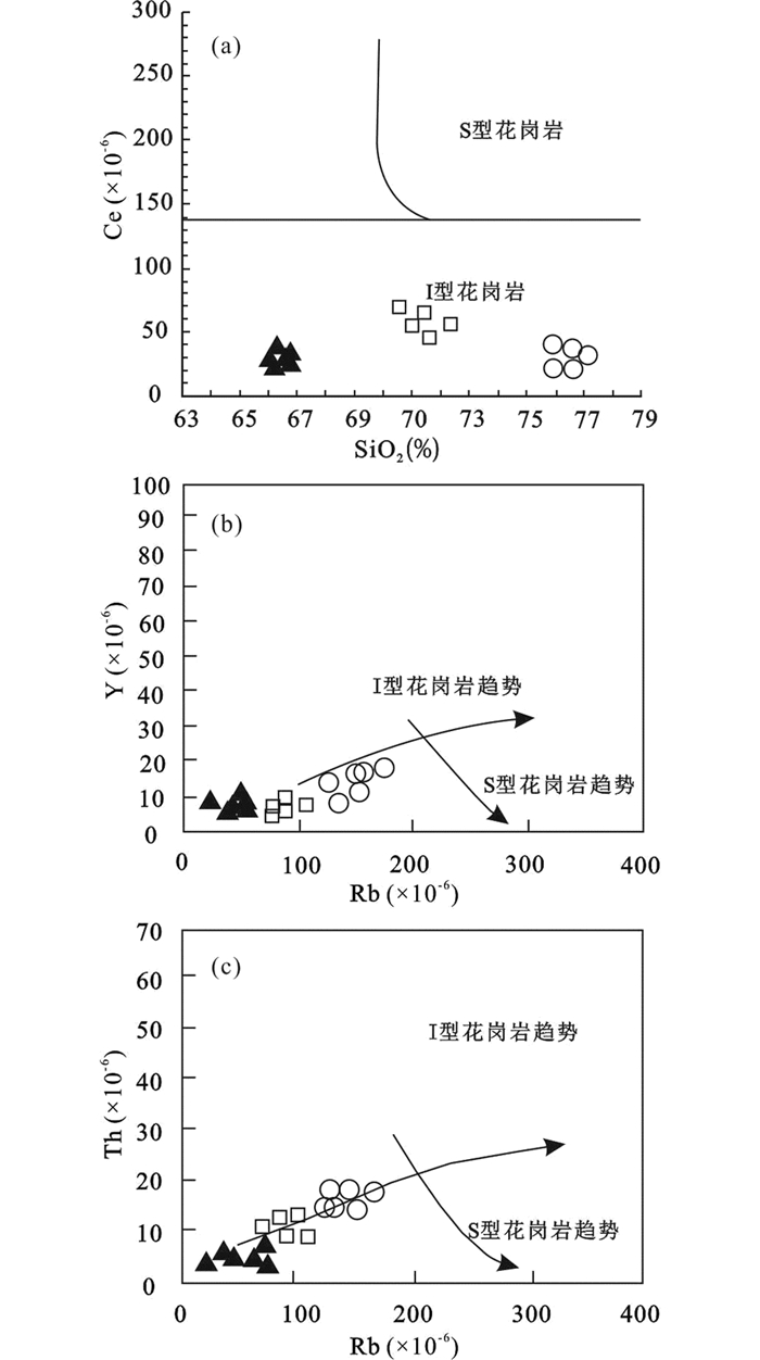 花岗岩的成因类型根据物质成分、构造环境、源区特征可划分为I型、S型、A型和M型(Chappell and White, 1974, 1991, 1999; Zheng et al., 2017a, b )。角闪石是判定I型花岗岩的特征矿物;而堇青石、石榴子石等富铝矿物则是判定S型花岗岩的特征性矿物;A型花岗岩碱性暗色矿物(钠闪石)是它的特征矿物(Chappell and White, 1974; Chappell, 1999; Chappell et al., 2012; Mille, 1985; Yang et al., 2008; Zheng et al., 2017a, b )。前人先后提出过很多花岗岩成因的判别方法,除了岩相学之外,可以利用微量元素图解进行判别,Whalen et al. (1987)提出了以104×Ga/Al与微量元素为基础的花岗岩分类判别图解(图 8),本次研究的样品大部分投点于I、S型花岗岩区域内。通常情况下,富集Th和Y的矿物在准铝质岩浆中是不会先结晶的,而在过铝质岩浆中则会优先结晶,这就会导致I型花岗岩比S型花岗岩有相对较高的Th与Y的含量,而且Th、Y和Rb都表现出正相关的关系(Wu et al., 2003; Li et al., 2007),后倒木花岗质岩石的Th、Y含量分别为3.72×10-6~18.03×10-6与6.72×10-6~12.57×10-6,显示了与Rb元素都呈现出正相关的关系(图 9b, c),便证明了后倒木的花岗质岩石属I型花岗岩;在SiO2-Ce图解中(图 9a),本次研究的样品均投入I型花岗岩区域内。另外,显微镜下没有发现作为S型花岗岩判定的标志性富铝矿物,像堇青石、石榴子石以及白云母等,更没有发现像铁橄榄石、钠闪石-钠铁闪石以及霓石-霓辉石等A型花岗岩判别的典型碱性暗色矿物,这就更加证明了后倒木花岗质岩石为I型花岗岩。综上所述,认为研究区花岗质岩石应属I型花岗岩,这也同区内广泛发育的I型花岗质岩石的类型相一致(葛文春等, 2007; 于晓飞等, 2012; Zhang et al., 2013; 刘万臻等, 2014; 王琳琳, 2018; Zheng and Yu, 2018)。