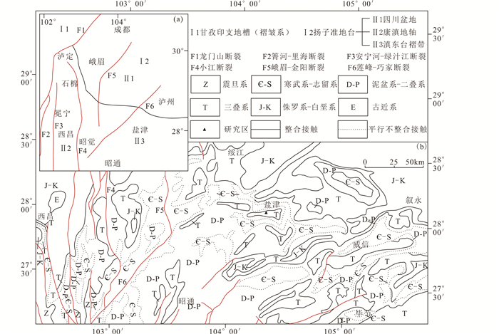 1 区域地质背景根据《云南省地质志》的划分,研究区所在的一级构造单位为扬子准地台,二级构造单元为滇东台褶带(云南省地质矿产局, 1982)(图 1)。经过晋宁运动之后的加里东、海西、印支、燕山、喜马拉雅各构造期,该区沉积了震旦系、古生界、中生界、新生界的巨厚盖层。区内出露的震旦系至白垩系均为整合或平行不整合接触,仅下白垩统与第四系之间为角度不整合接触,表明该区沉积盖层于晚燕山期褶皱定型。其中上古生界与下古生界的广西运动造成的平行不整合是区内最大的沉积间断。关岭组底部绿豆岩在盐津-大关-雷波-永善-沐川四川盆地西南缘一带地表广泛分布,往南至云南昭通一带因关岭组沉积之后的抬升剥蚀而不发育。