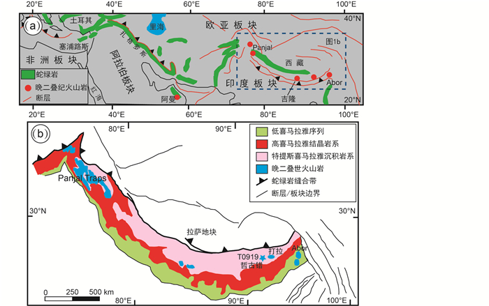 图 1 新特提斯带简要地质图(a)和喜马拉雅地区晚二叠世岩浆作用分布图(b) Fig. 1 Simplified geological map of the Neo-Theyan belt showing the major ophiolite sequences and the Late Permian volcanic rocks (a) and the distribution of Permian magmatism in the Himalayas (b) |