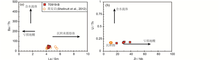 A型花岗岩是花岗岩类(ISAM)的典型类别之一,具有碱性、贫水的特征,是非造山作用背景下的产物(Eby, 1990)。根据源区和构造环境的不同,A型花岗岩又被细分为A1型和A2型花岗岩,一般来说,A1型花岗岩与热点、地幔柱或非造山环境的大陆裂谷带相关。A2型花岗岩则表明其岩浆源区为经历过陆-陆碰撞或弧岩浆作用旋回的陆壳或下地壳(Eby, 1992)。一般认为酸性岩有三种成因机制:(1)长英质熔体来自于镁铁质下地壳部分熔融(Draper, 1991; Borg and Clynne, 1998; He et al., 2011);(2)酸性岩是由单一地幔岩浆源区经历不同程度的分离结晶而形成(Barker and Arth, 1976; Mccurry et al., 2008);(3)长英质熔体和镁铁质熔体混合形成(Vernon, 1990; Bateman, 1995)。哲古错花岗闪长岩都显示出高的A/NK比值,在A/CNK-A/NK图解中(图 6b),所有的花岗闪长岩样品都表现出偏铝质组成。结合微量元素对比值La/Sm-Ba/Th(图 10a)关系图解和Zr/Nb-U/Th(图 10b)关系图解,表明岩浆来自沉积来源熔体,但有一定的亏损地幔物质加入。所有样品的εNd(t)=+1.1~+2.3,同样表明可能有地幔物质的加入。而同时代的英安岩(Shellnutt et al., 2012)则没有地幔物质的加入(图 10b)。所有样品富集LREE而亏损HREE(图 7a),但没有明显的Eu异常(Eu/Eu*=0.94~1.10),表明斜长石分离结晶作用不明显,样品与初始岩浆接近。在原始地幔标准化微量元素图解中(图 7b),所有样品显示出富集LILE,特别是K、Rb、Ba、Th等元素,高场强元素Nb、Ta、Ti负异常,但Zr和Hf为正异常,与典型的弧岩浆岩不同,但与伸展构造背景下形成的岩浆岩类似。